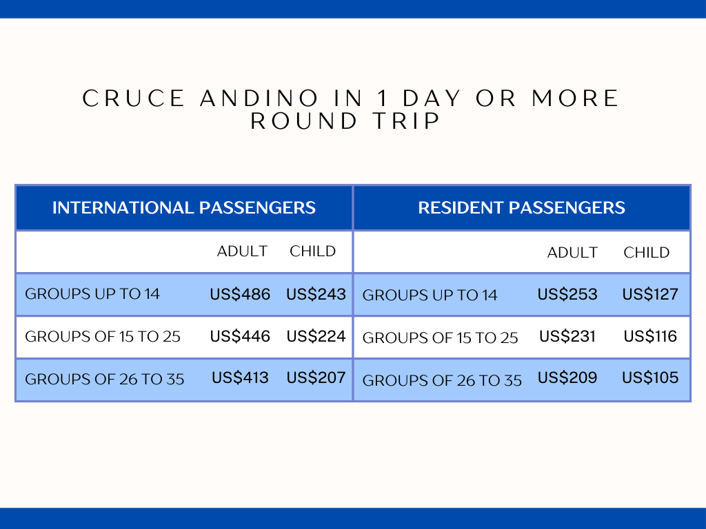 • The rate for resident passengers (Chilean or Argentinean) corresponds to a one-way ticket, and includes the return trip at no additional